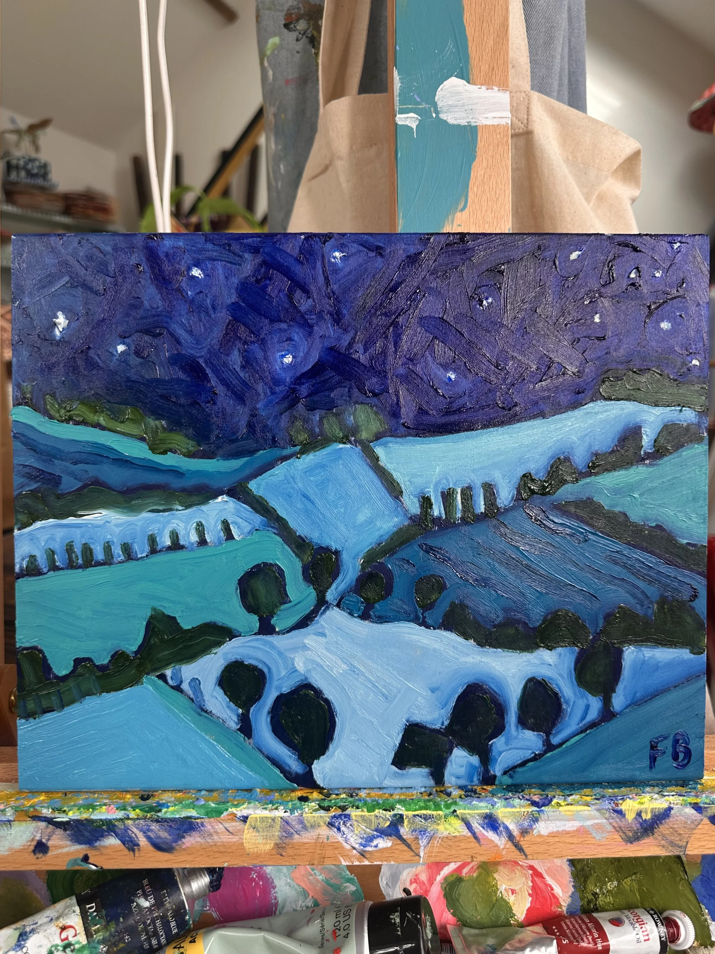 For Sale › Star Lit Landscape Image 1 of 1 Star Lit Landscape £285.00 Oil on mounted board (no frame) Add To Cart Added! Oil on mounted board (no frame)